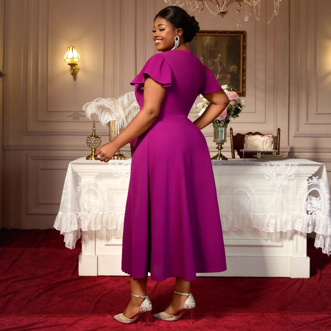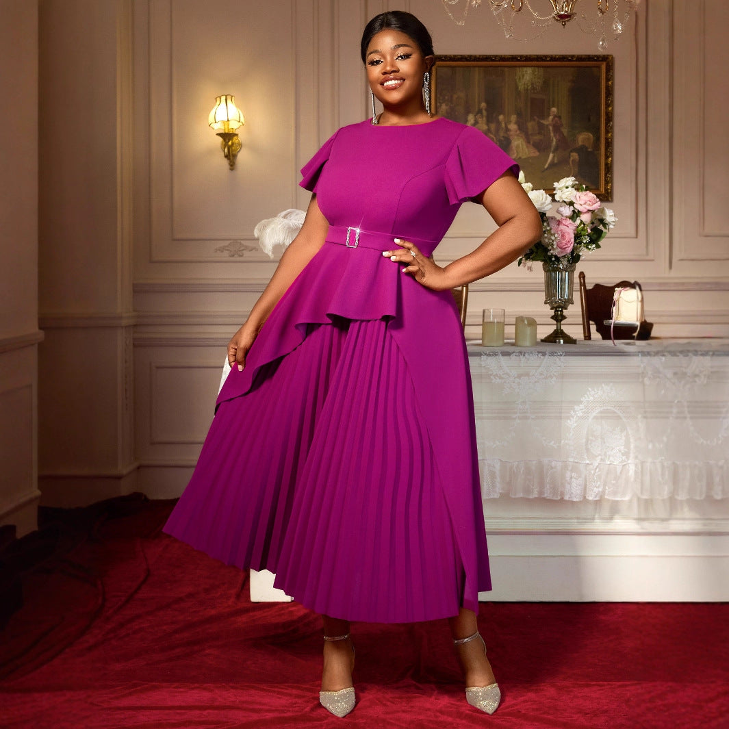 Women's Round Neck Short Sleeve Ruffled Long Pleated Dress